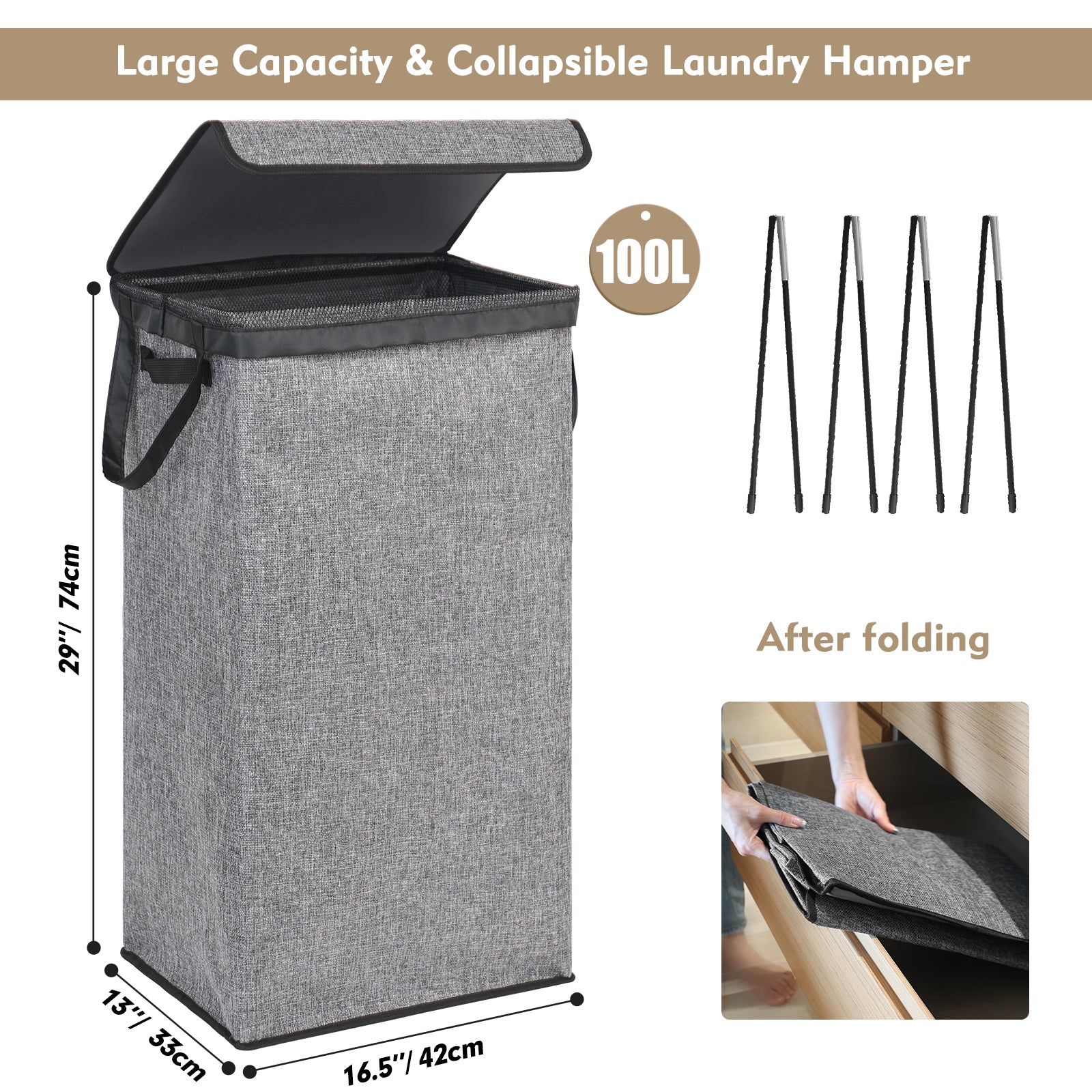 - Four Fiber Poles: Provide additional support and structure, ensuring the stability and durability of the laundry basket.