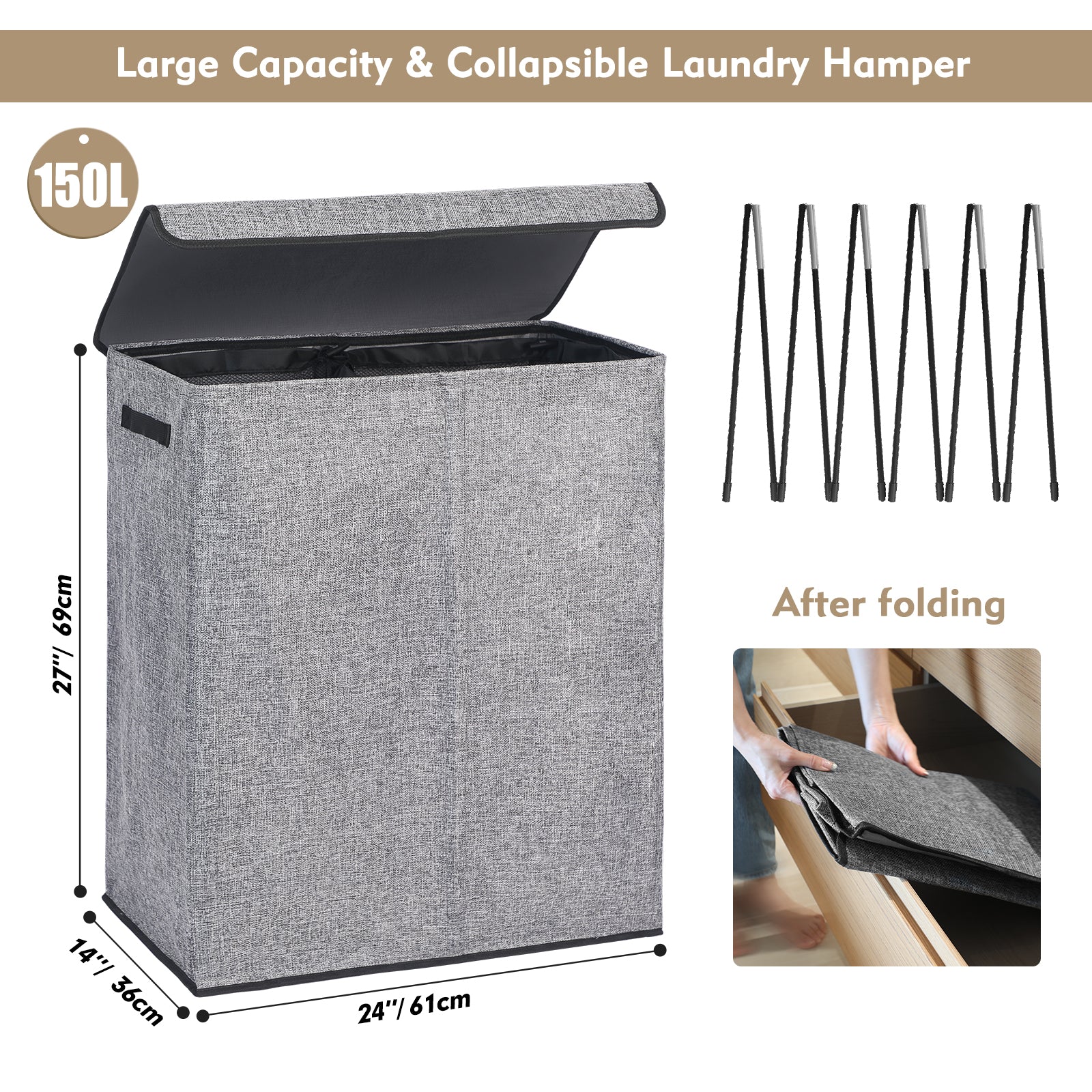 - Double-layer Fabric Material: Made of double-layer fabric, enhancing the durability and texture of the laundry hamper, while effectively preventing the spread of clothing odors.